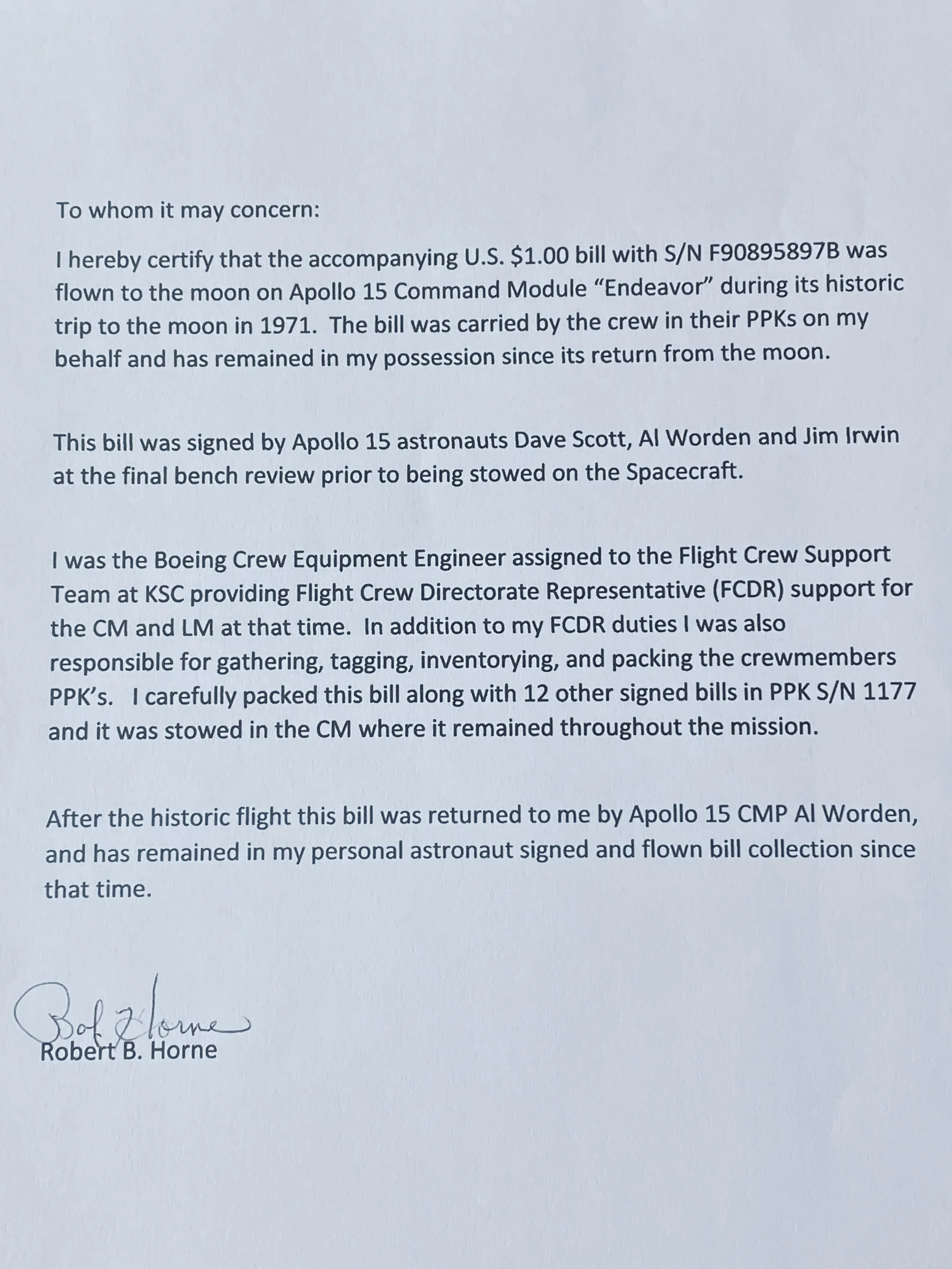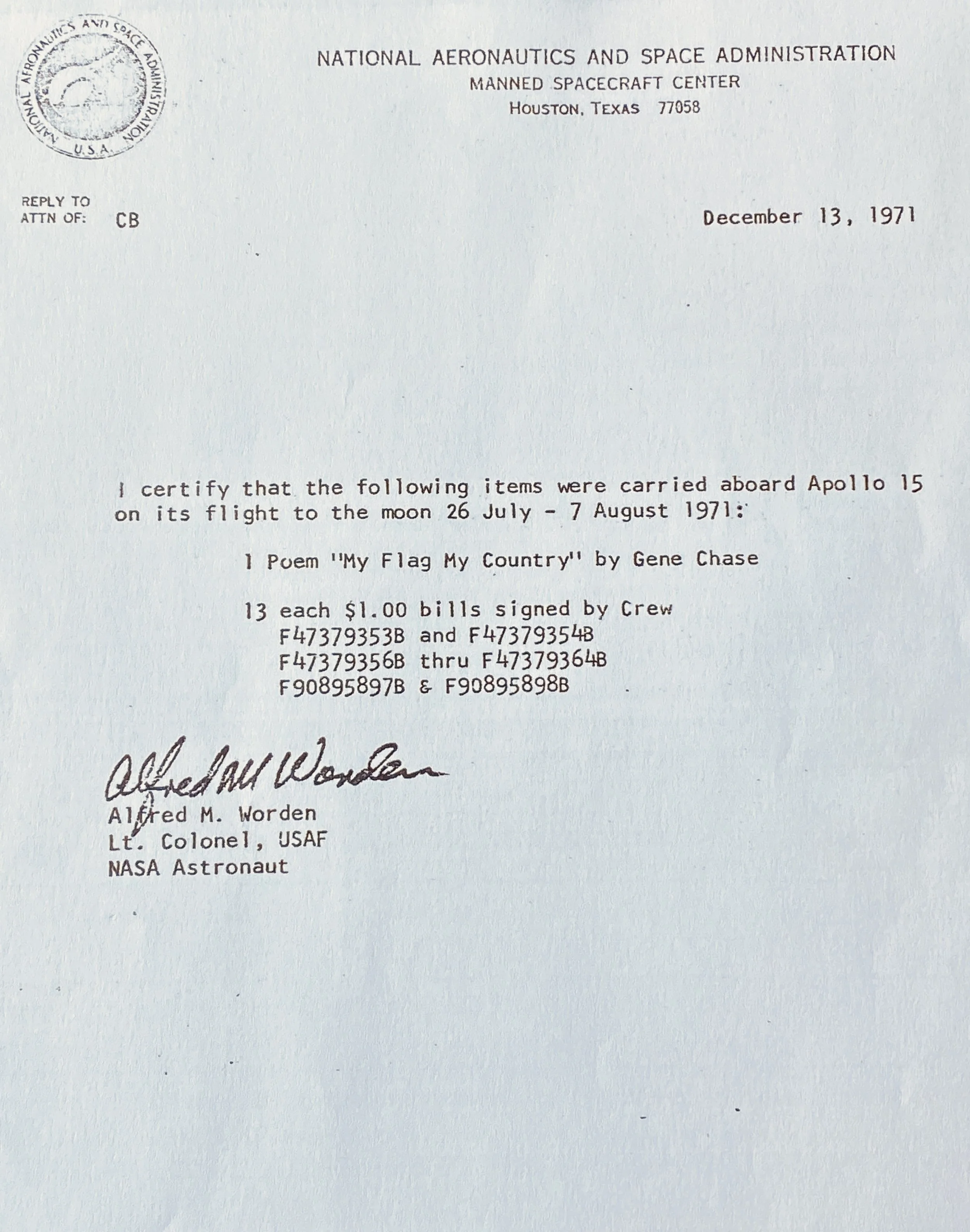 A copy of the original letter that Bob Horne received from Apollo 15 LMP Lt. Col. Alfred M. Worden upon the return of his 13 moon flown $1 bills.