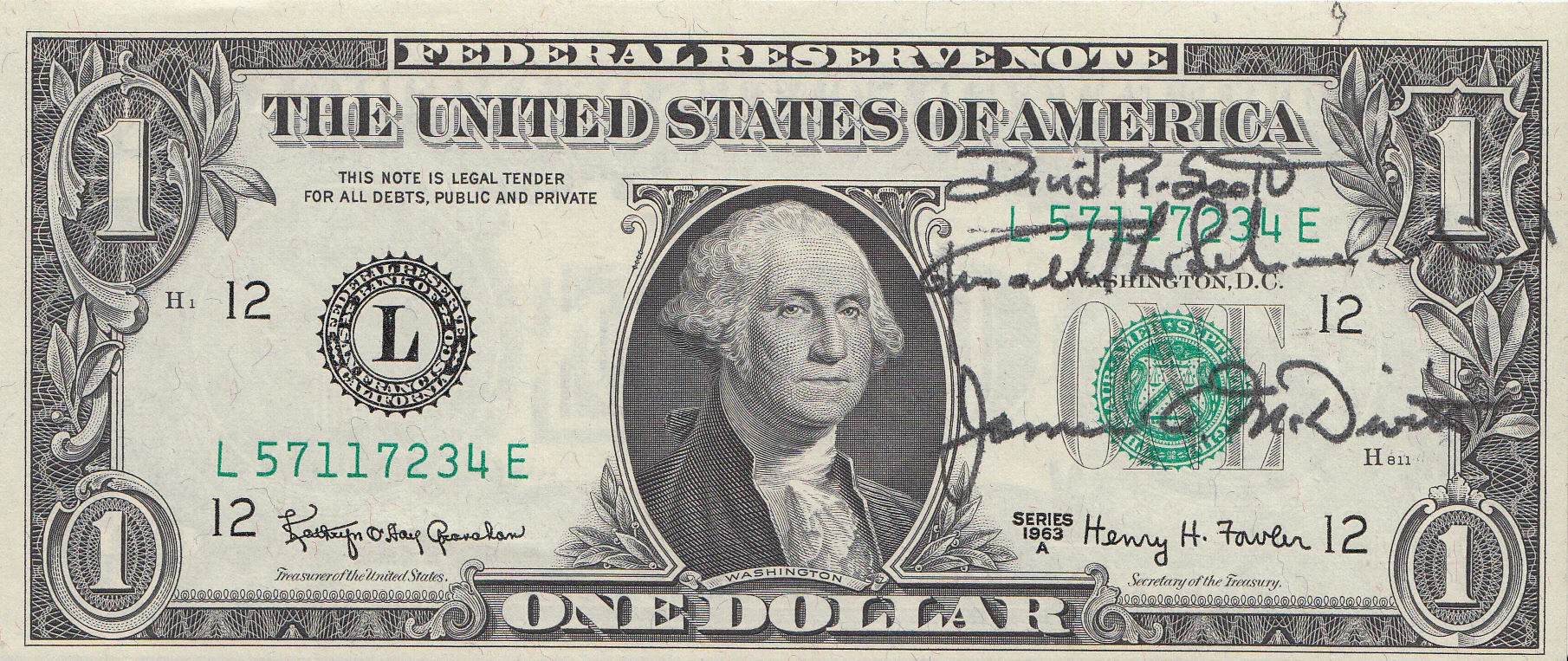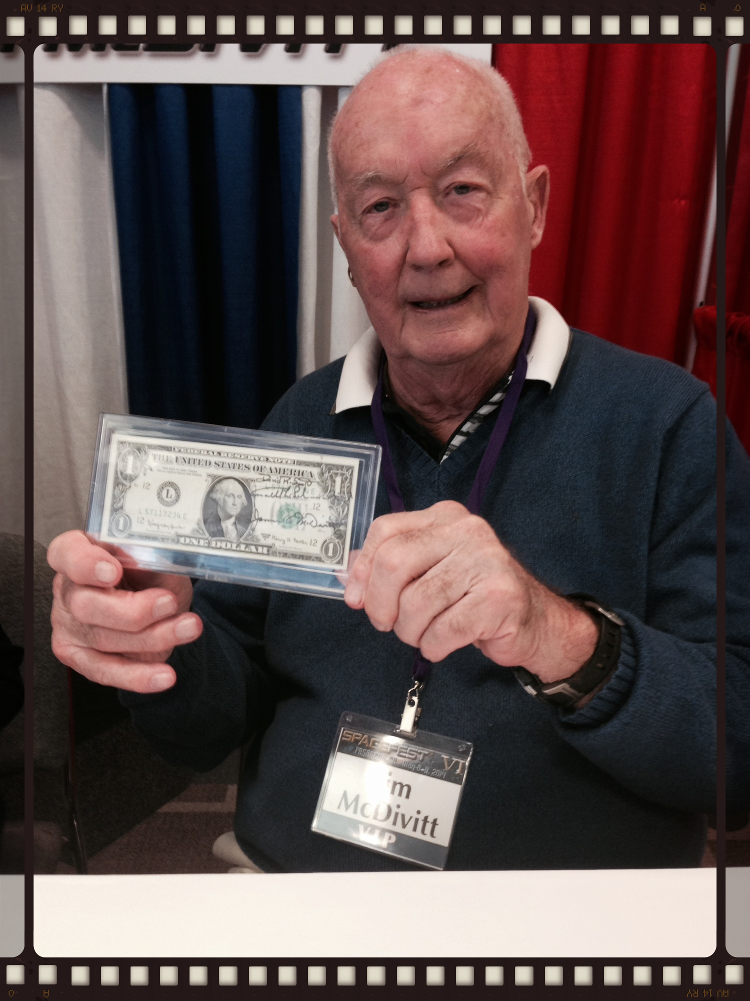 The preceding bill, with serial number L57117235E, was donated to the Smithsonian. This bill, with serial number L57117234E, was retained in the Dillaway family space collection until offered for sale via public auction. Subsequent to acquiring the bill, I had the opportunity to reunite Commander Jim McDivitt with the bill, who inspected it and confirmed it and the crew's signatures. He signed a history and flight certification sheet, and graciously posed with the bill -- thus making this one of the very few (if not the only) astronaut certified NAA flown bills in private hands.