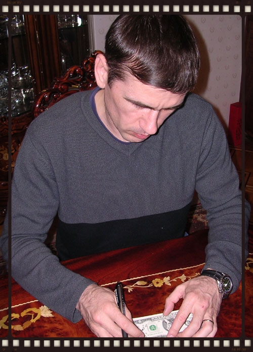 Yuri flight certifying one of the flown $2 bills taken aboard by him on his ISS 7 mission.