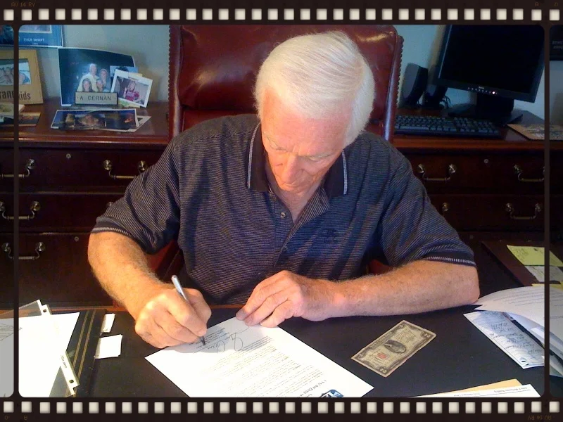 Captain Eugene Cernan, in his Houston office, flight certifying this bill from his collection, and attesting to its history.