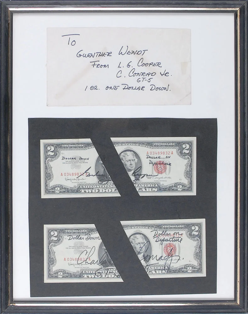 One half of the bills represented "a dollar" given to Wendt on departure, as the last human that the crew would interact with physically before launching into space. The other half of each bill was given to Wendt upon splashdown, thus the "dollar down" notation. Despite Wendt confusing which half of each bill flew, these historic $2 bills represent one of the most unique bill-sets in the collection.