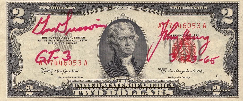 A $2 bill flown on the historic flight of Gemini 3 on March 23, 1965.