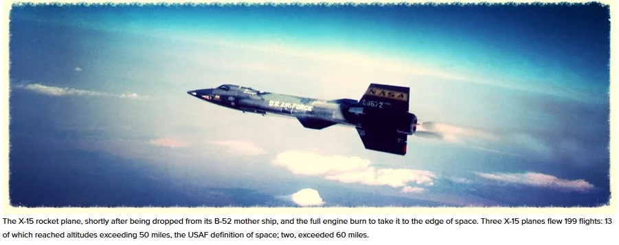 The X-15, built by North American Aviation, was a rocket-powered, winged aircraft operated jointly by the USAF and NASA. The X-15 established speed and altitude records in the 1960's -- and still holds the official world's speed record for a manned, powered aircraft at 4,520 m.p.h. Of 199 overall flights with three X-15 aircraft, 13 exceeded 50 miles in altitude -- the USAF definition of the edge of space in the 1960's -- and two of the 13 reached 60 miles, the standard international definition of the edge of space.