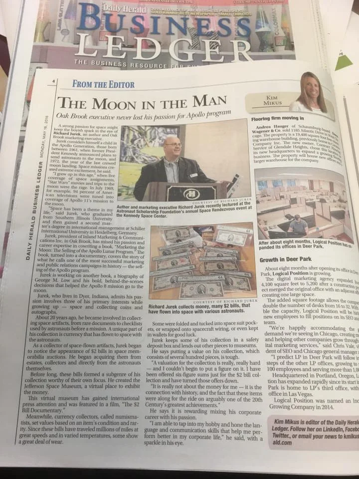 A nice write up and profile of Jefferson Space Museum founder Richard Jurek, and the unique collection of space flown $2 bills in the Daily Herald's Business Ledger Section.